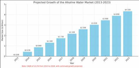 The alkaline water market is projected to reach $4.32 billion by 2023, growing at a CAGR of 12.2% from 2013 to 2018, driven by increasing health consciousness among consumers. Positioned in the premium water category, alkaline water’s popularity stems from its health benefits and lifestyle appeal. This market growth reflects a larger trend towards healthier living and premium hydration choices, indicating a promising future for the alkaline water industry in both global and U.S. markets.