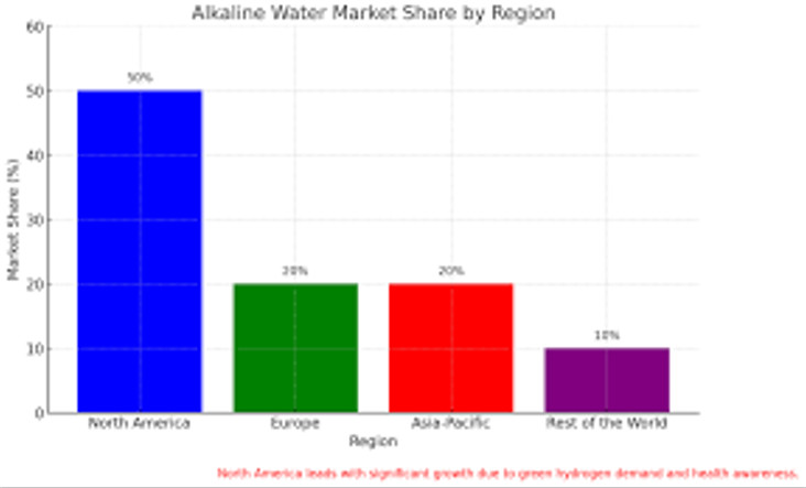 The alkaline water market is diverse, and segmented by product type, application, and region. Pie charts reveal the variety of alkaline water products and their applications across different industries. Bar graphs emphasize North America’s significant market share, attributed to the growing demand for green hydrogen and an increasing number of health-conscious consumers. This segmentation reflects the market’s adaptability and its wide-ranging appeal in various sectors.